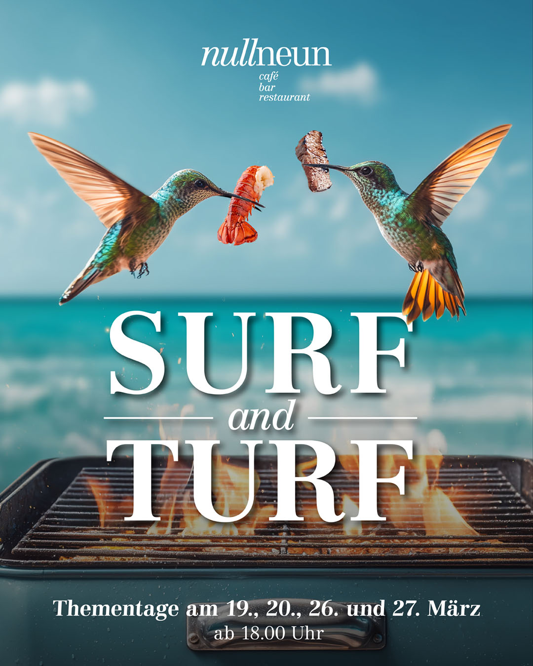 Wenn saftiges Steak auf feine Meeresfrüchte trifft, ist es Zeit für unsere „Surf & Turf“ Thementage am 19.–20.03. und 26.–27.03.. Freuen Sie sich auf außergewöhnliche Geschmackskombinationen, beste Zutaten und kulinarische Highlights, die Land und Meer auf genussvolle Weise vereinen.